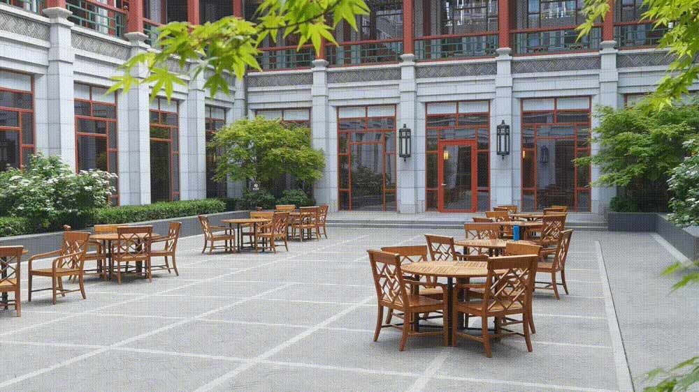 红色木质游廊,方方正正,以传统青砖为背景,上有红檐灰瓦,下有中庭小院,充满了东方神韵。