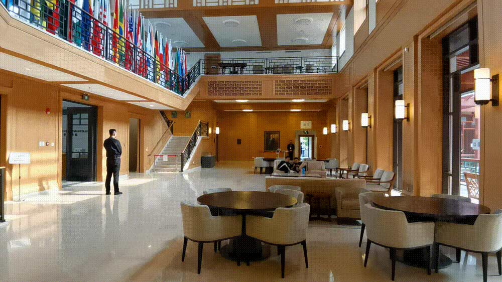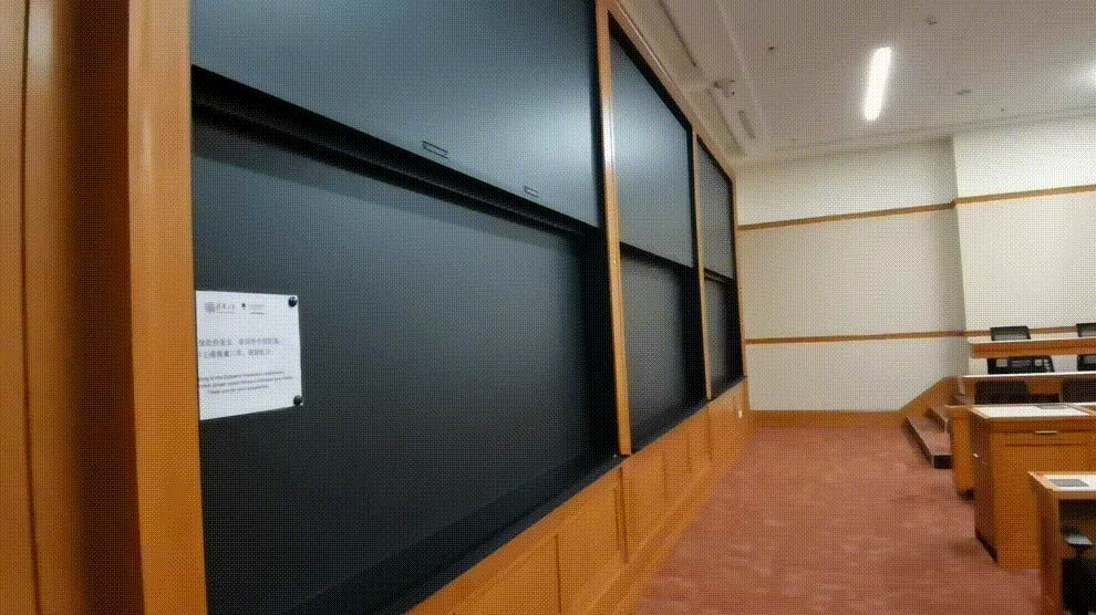 书院共有4间55座位的教室,装备了先进视听网络设备和同传设备。2020年疫情袭来,书院在快速完成在线教学的推进后,秋季学期开始启用融合教室以满足线上线下共同上课的需要。教室布局为半椭圆对称式设计,这样的布局有利于同学之间的交流和讨论,也方便教授随时可以贴近每一位同学以便时刻掌握课堂节奏。