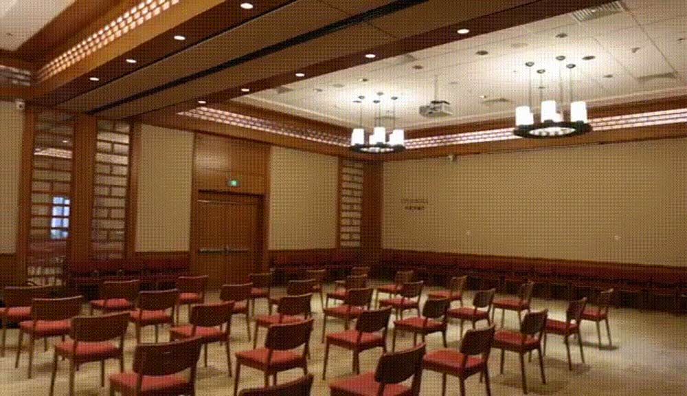 书院每个学年都要组织大中型的活动50余场,多功能厅是重要的活动场地之一。多功能厅作为一个大厅,可以同时容纳150-200人进行活动,也可以隔断成三个小厅独立使用。上收式隔断的设计,使大厅总体视觉上浑然一体,没有割裂感。