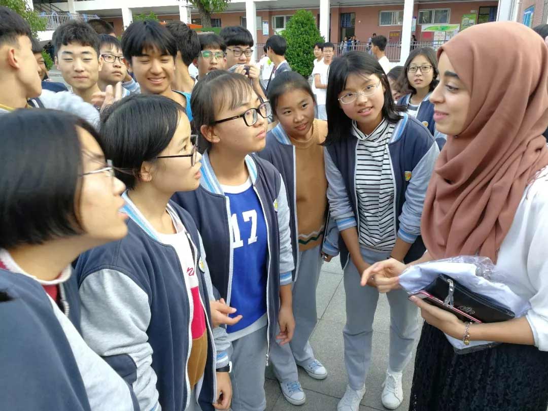 苏世民学者宋云歌(Rebecca Singer)和伊曼(Imane El Morabit)与四川盐边中学林荫公益班同学们在一起