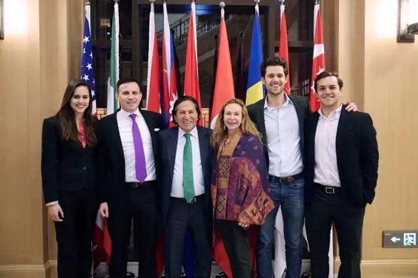 并借此机会与大家分享对领导力的认识和体会。托莱多还表达了对夫人——经济学兼人类学家卡普女士的感谢与敬意,他幽默地说“拥有好的妻子能成就一个总统”并邀请卡普女士简单介绍了秘鲁在多文化下产生的社会现象,以及自然资源短缺、气候变化等一系列问题。