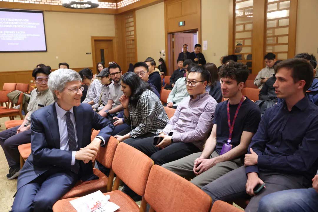 在交流环节,师生们就气候变化、地缘政治与全球经济发展等议题积极提问,萨克斯教授一一作答。他特别指出,区域经济发展的关键在于邻国关系、基础设施建设与地区合作,并强调全球经济体系亟需更公平的财富分配,以打破历史上不断重演的危机循环。