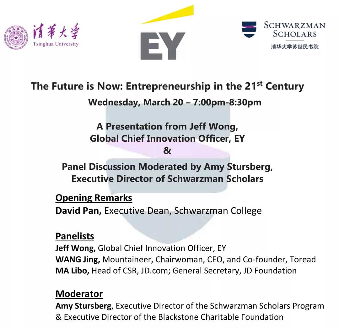 Jeff Wong’s presentation will share some of the latest innovations and how they are helping to solve big, real-world problems, from agriculture to transportation. Jeff’s presentation is followed by a panel discussion featuring entrepreneurs Jeff Wong, WANG Jing and MA Libo, moderated by Amy Stursberg. They will discuss their paths to entrepreneurship, how they are shaping their industries now and for the future, what it means to be an ethical leader, and what an increasingly globalized and interconnected world means for entrepreneurship and their business.